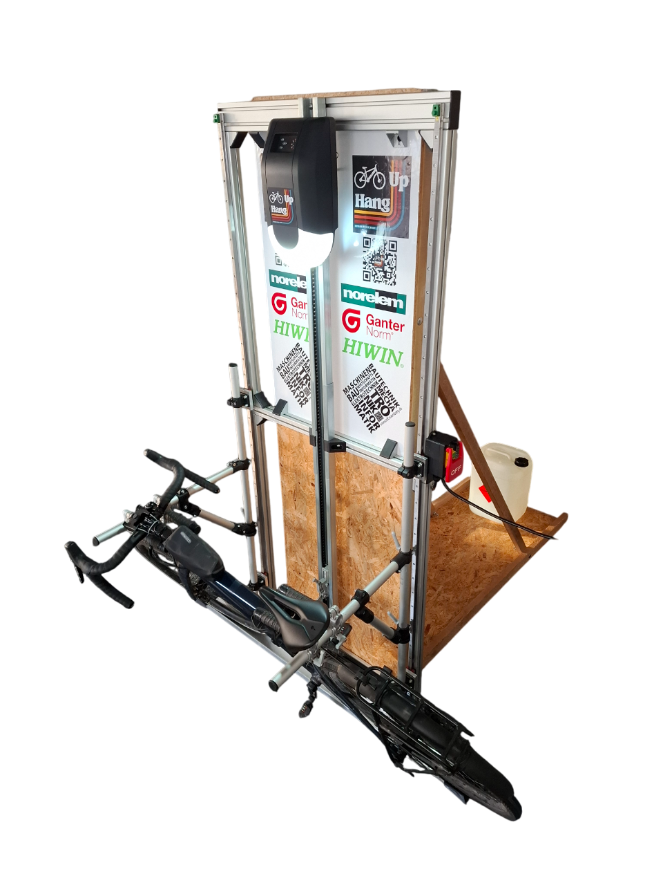 Dieses Konzept wurde von vier angehenden Maschinenbautechnikern entwickelt und stellt eine praxisnahe Umsetzung maschinenbautechnischer Prinzipien dar. HangUp kombiniert moderne Antriebstechnik mit einem funktionalen Design, um eine effiziente und durchdachte Lösung für die Fahrradlagerung zu bieten